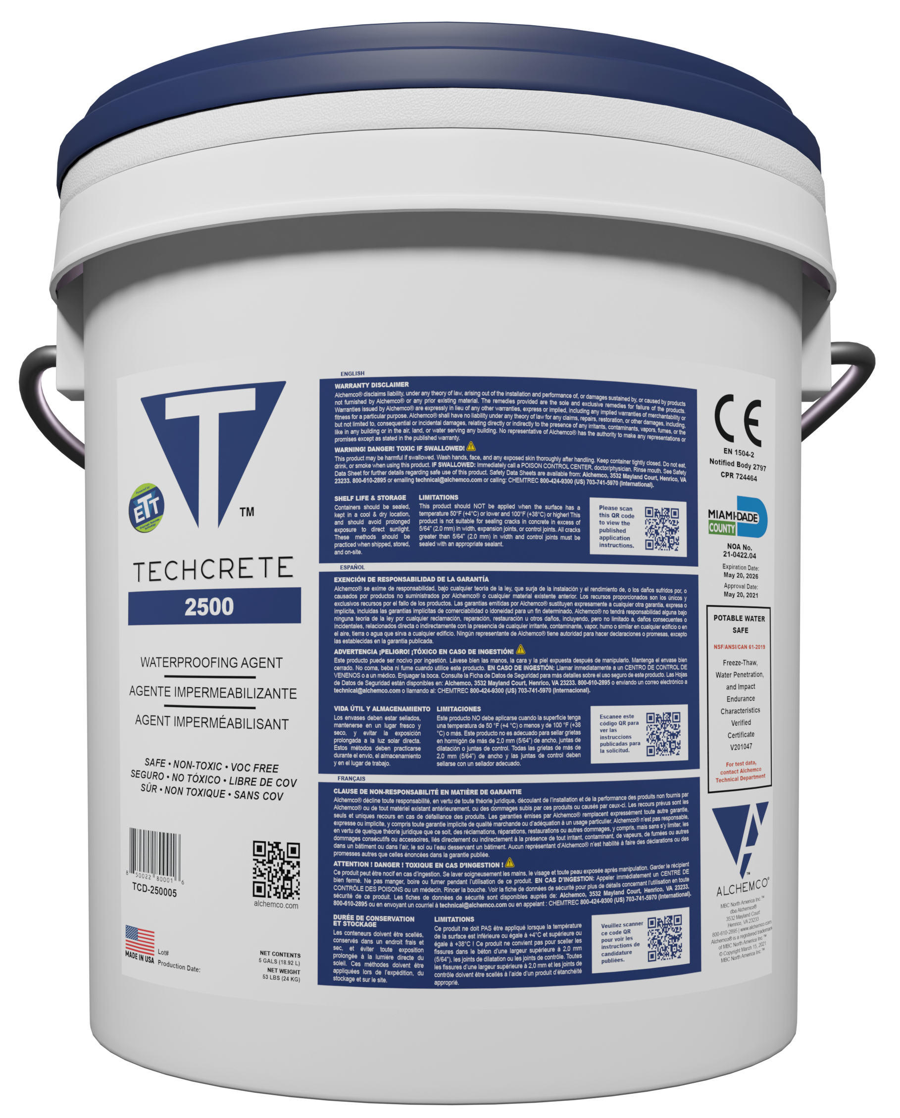 Alchemco TechCrete 2500 Watertite System is an enzyme-modified subsurface waterproofing solution for concrete and masonry. It penetrates deep into the substrate, reacting with calcium to form a flexible, vapor-permeable gel that fills pores and cracks. This internal barrier protects against water and contaminants while sealing existing cracks up to 2.0 mm and future cracks up to 1.5 mm.